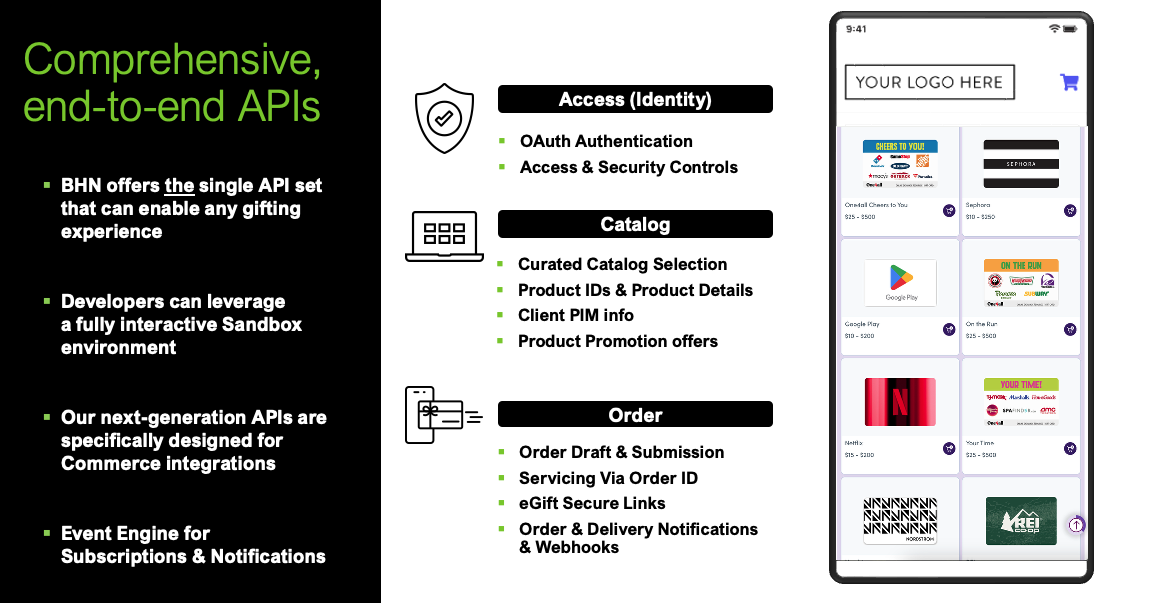 At BHN, we provide APIs for our customers who want to provide powerful rewards and incentives, using digital gift cards, in your apps and platforms. With the BHN API, you can easily integrate a catalog and generate a Gift card for Gifting or self use. The most used API methods include getting content information, posting payment and orders and getting order details.